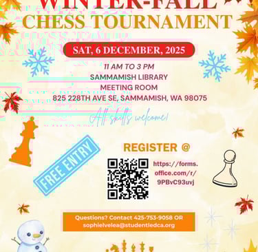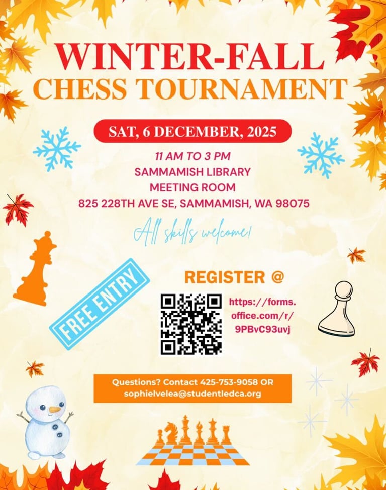 Washington State invites you to join them on Saturday, December 6th, for a 4-round tournament! This event will take place at the Sammamish Library from 11:00 AM to 3:00 PM.